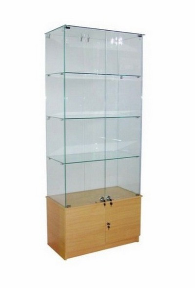 Размеры: 850 мм х 450 мм х 2060 мм., Высота подиума 50 мм. Толщина стекла 5 мм, Кол-во полок 4 шт., толщина полки 6 мм. Двери распашные с замками. Цвет бук.